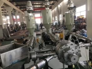 PPR冷热水管挤出机生产设备1.该机主要用于以PPR树脂为原料的管材生产 2.采用开槽喂料机筒及屏障式螺杆设计,可提高塑化效果. 3.挤出量高,熔体温度